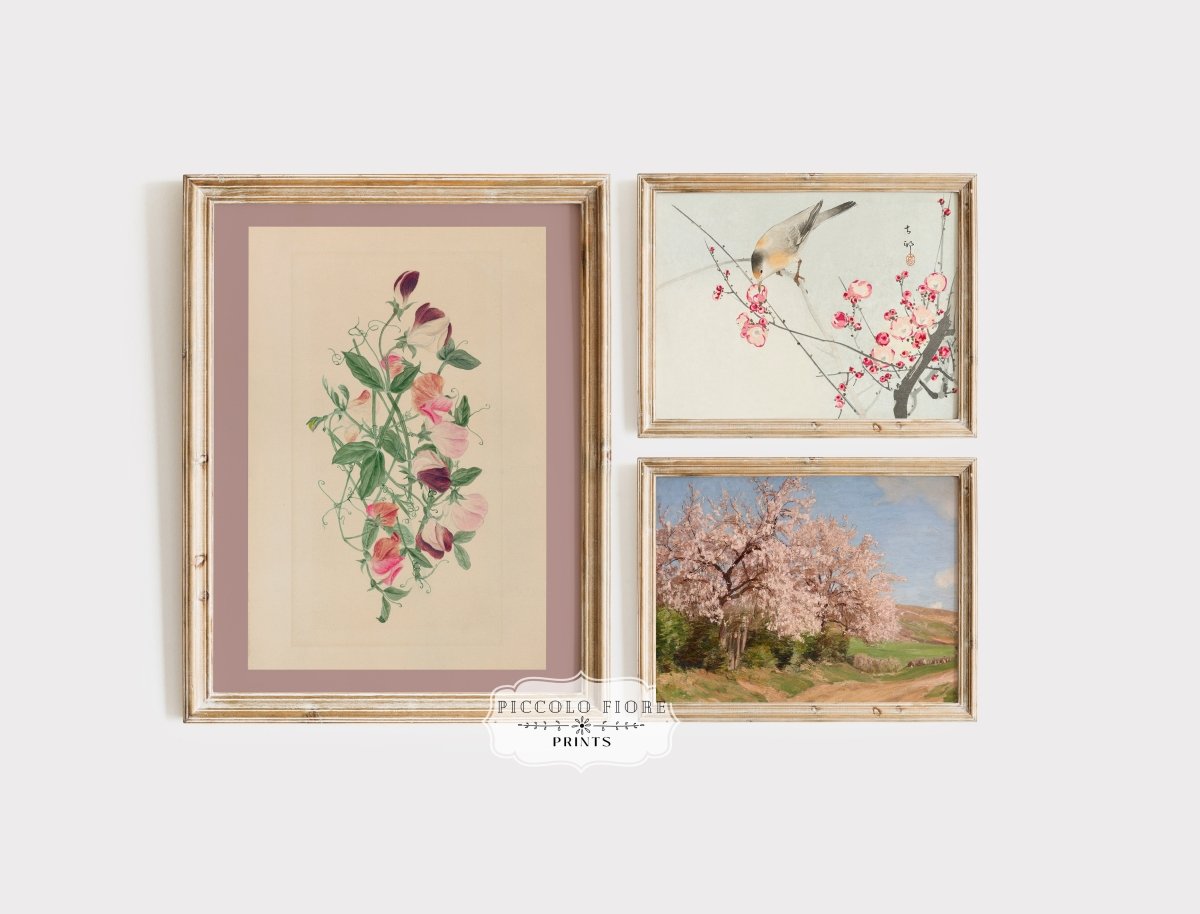 A set of 3 eclectic vintage gallery wall prints from the 1800s and early 1900s in a pretty pink colour palette. This gallery wall art features paintings and illustrations of blossom trees, sweet pea flowers and a Japanese watercolour of a bird in a tree with pink blossom.