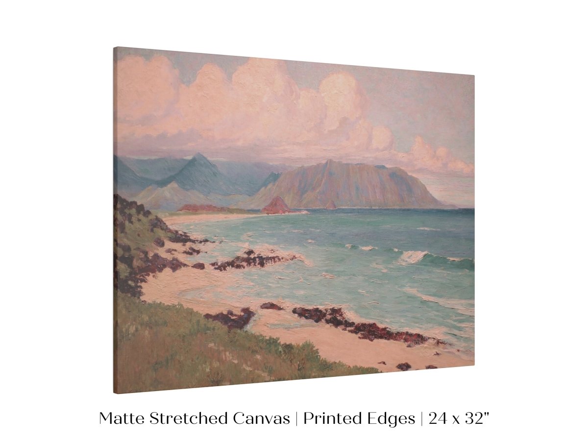 Vintage seascape oil painting from the 1920s of a rocky beach, sea, mountains and puffy clouds in a pastel turquoise, green, pink and grey colour palette.