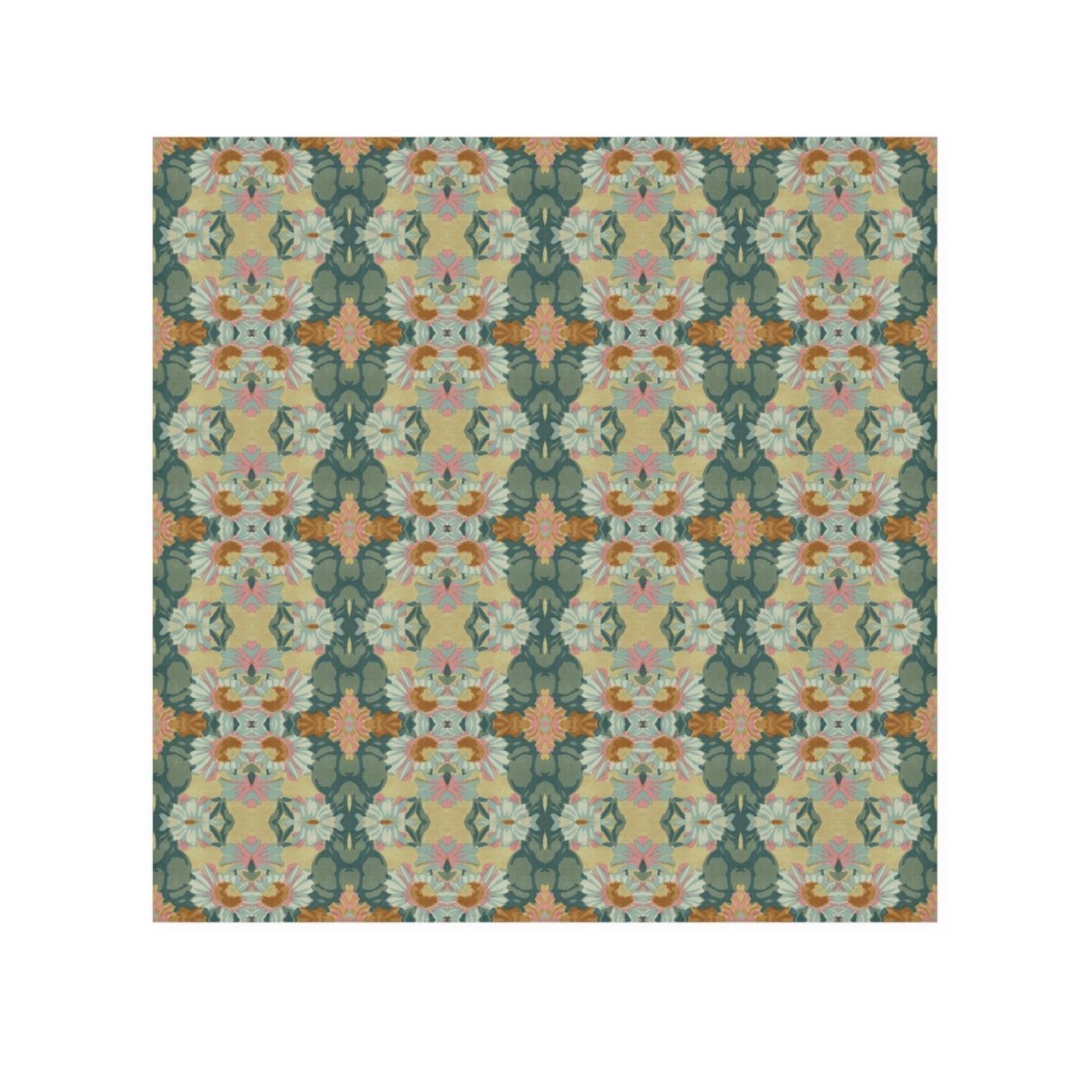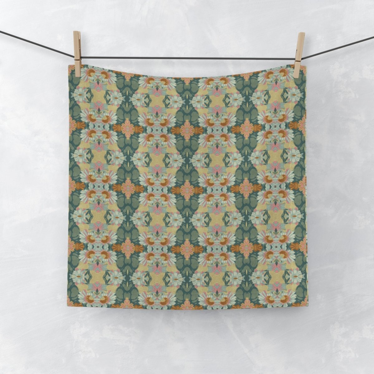 A retro floral burst damask stripe face towel in a muted sandy beige, green, pink, blue and orange, created from an original vintage floral pattern.