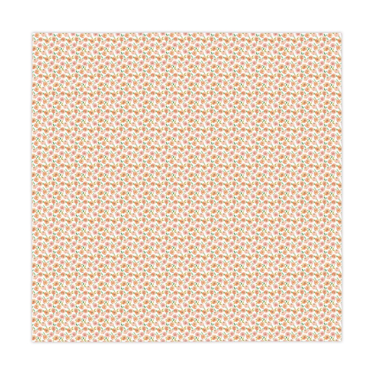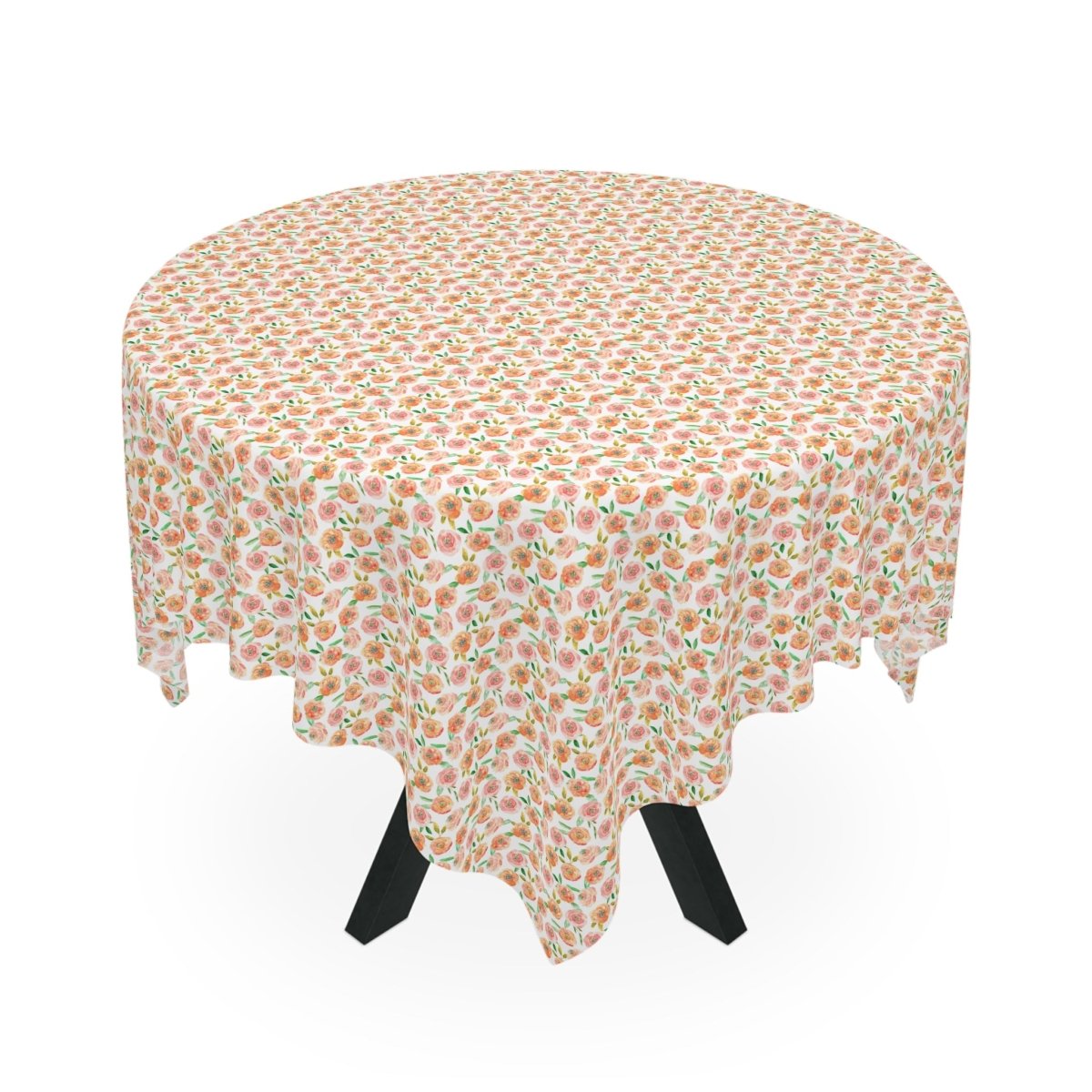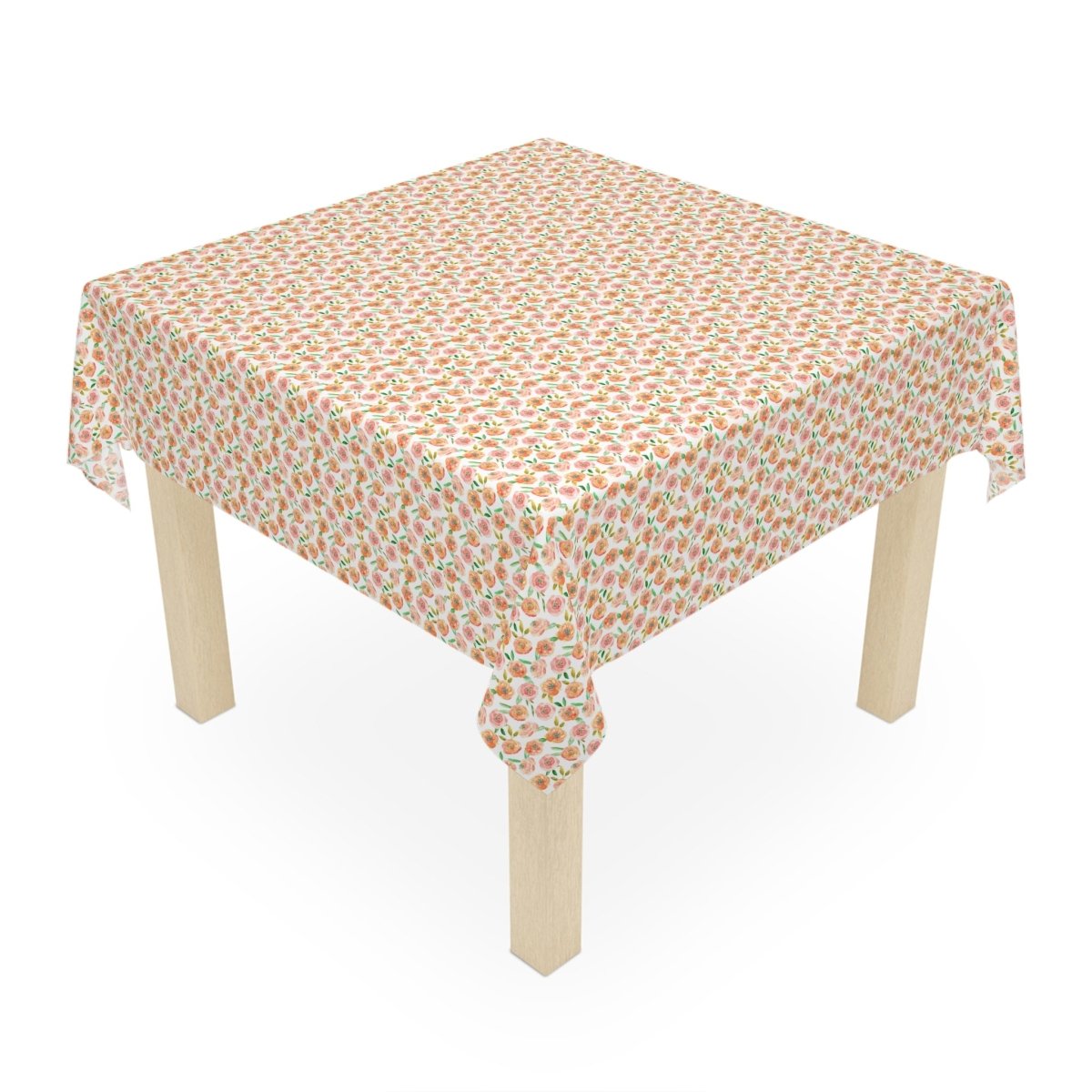 Tablecloth with handpainted peach peonies on a crisp white background.