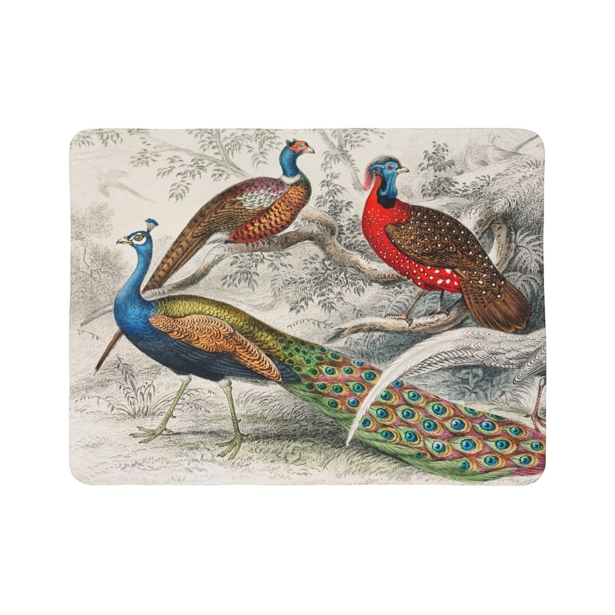 Fleece sherpa blanket featuring a vintage illustration of three peacocks in vibrant colours.