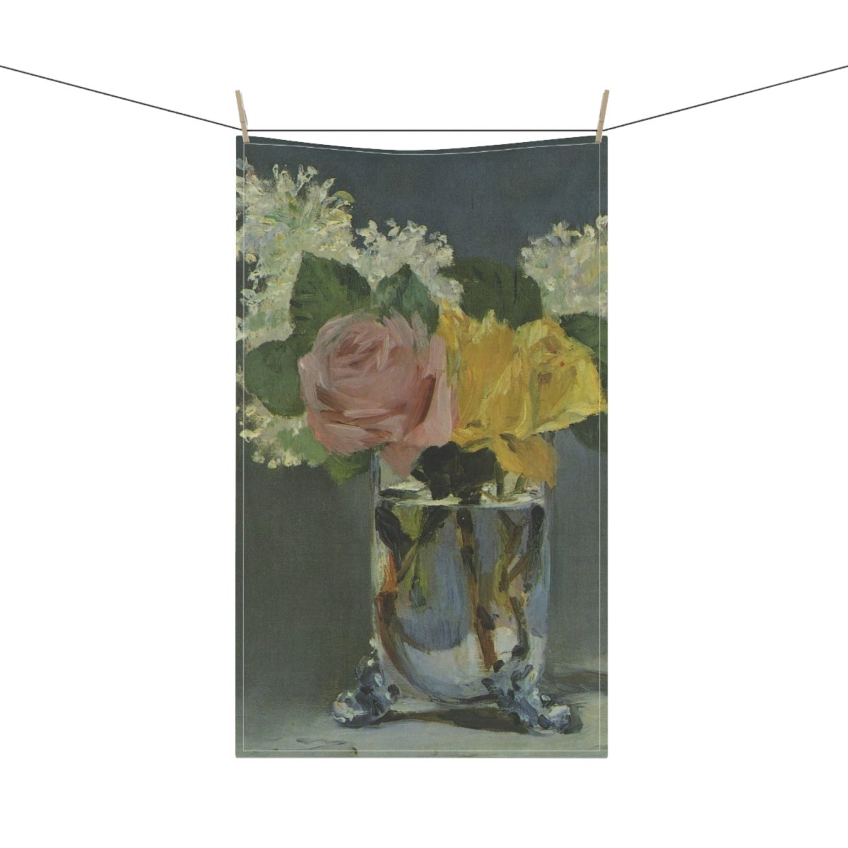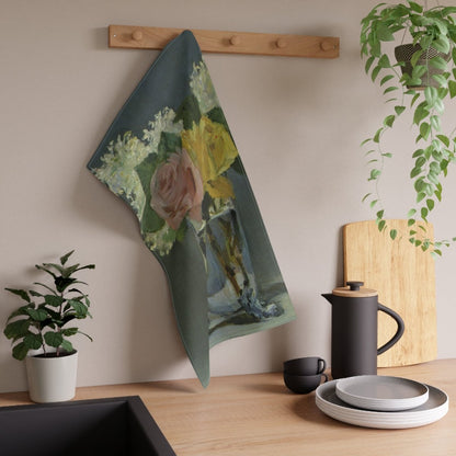 Tea towel featuring an oil painting of pink and yellow roses and white lilies, from our vintage Still Life collection.