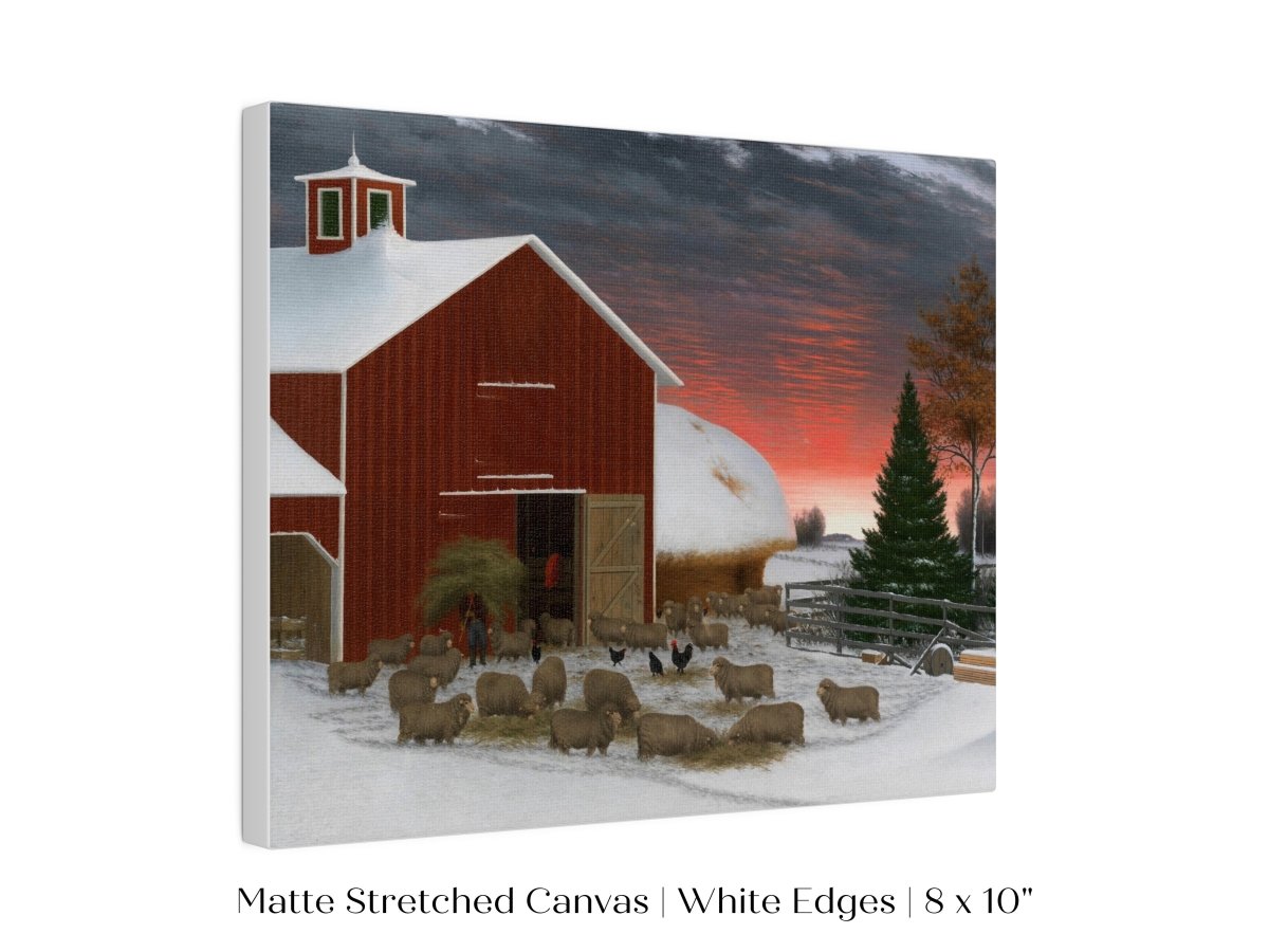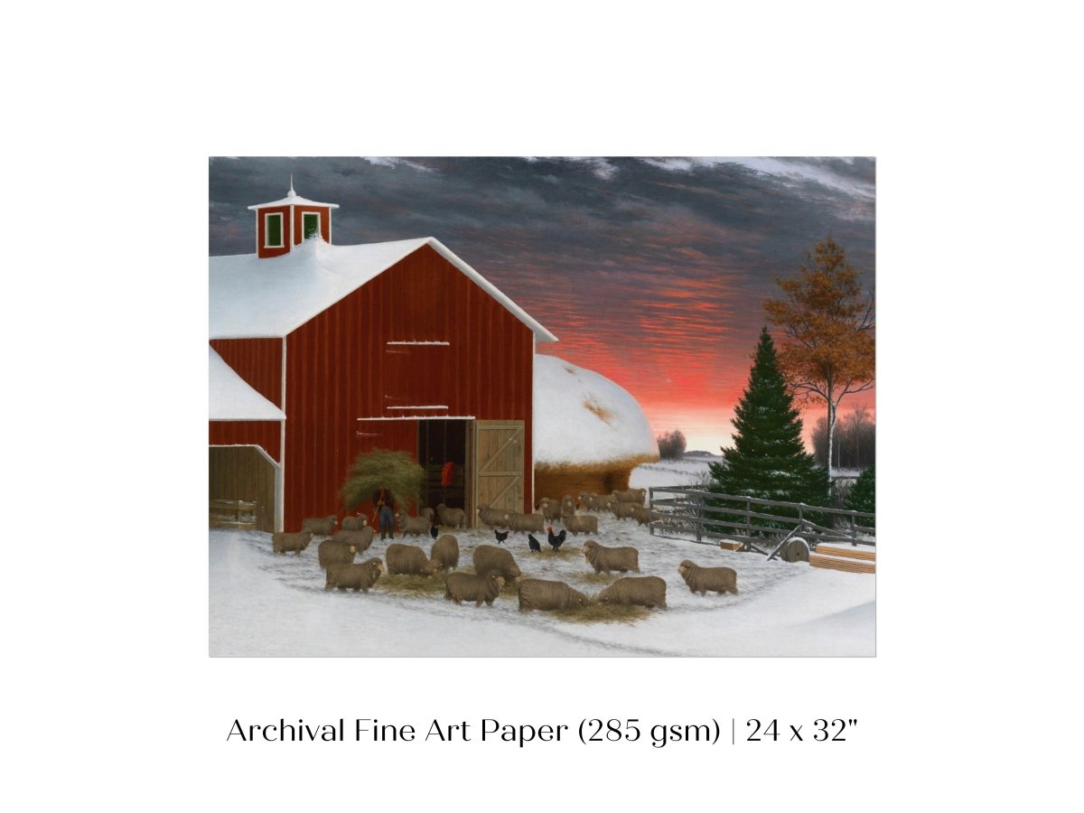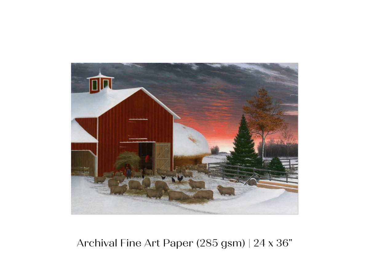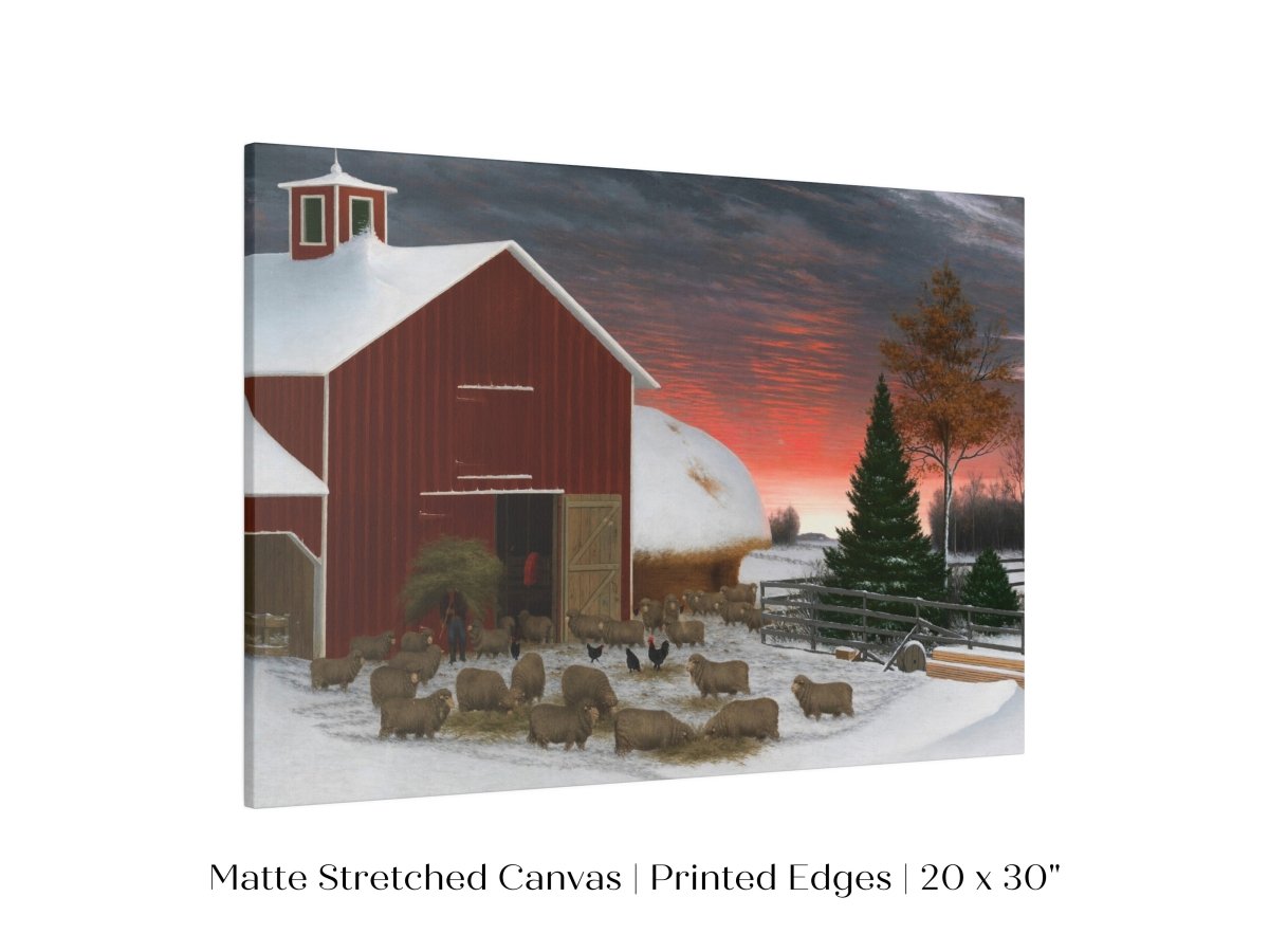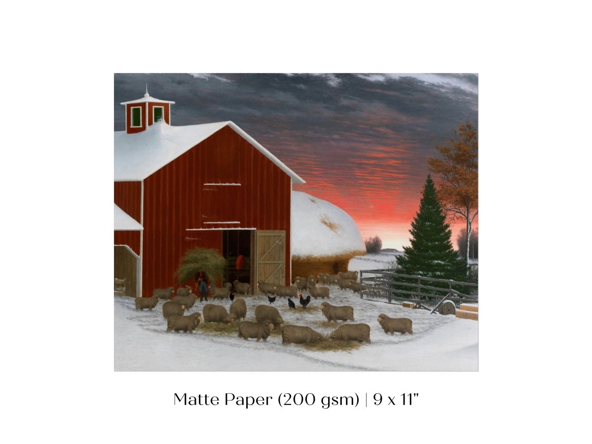 Vintage Barnyard in Winter snowy farmhouse/country landscape oil painting in burgundy, grey and white colour palette.