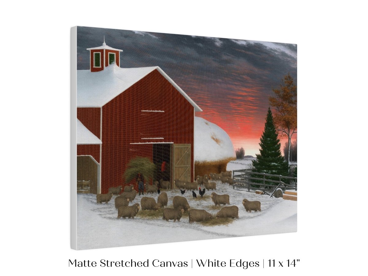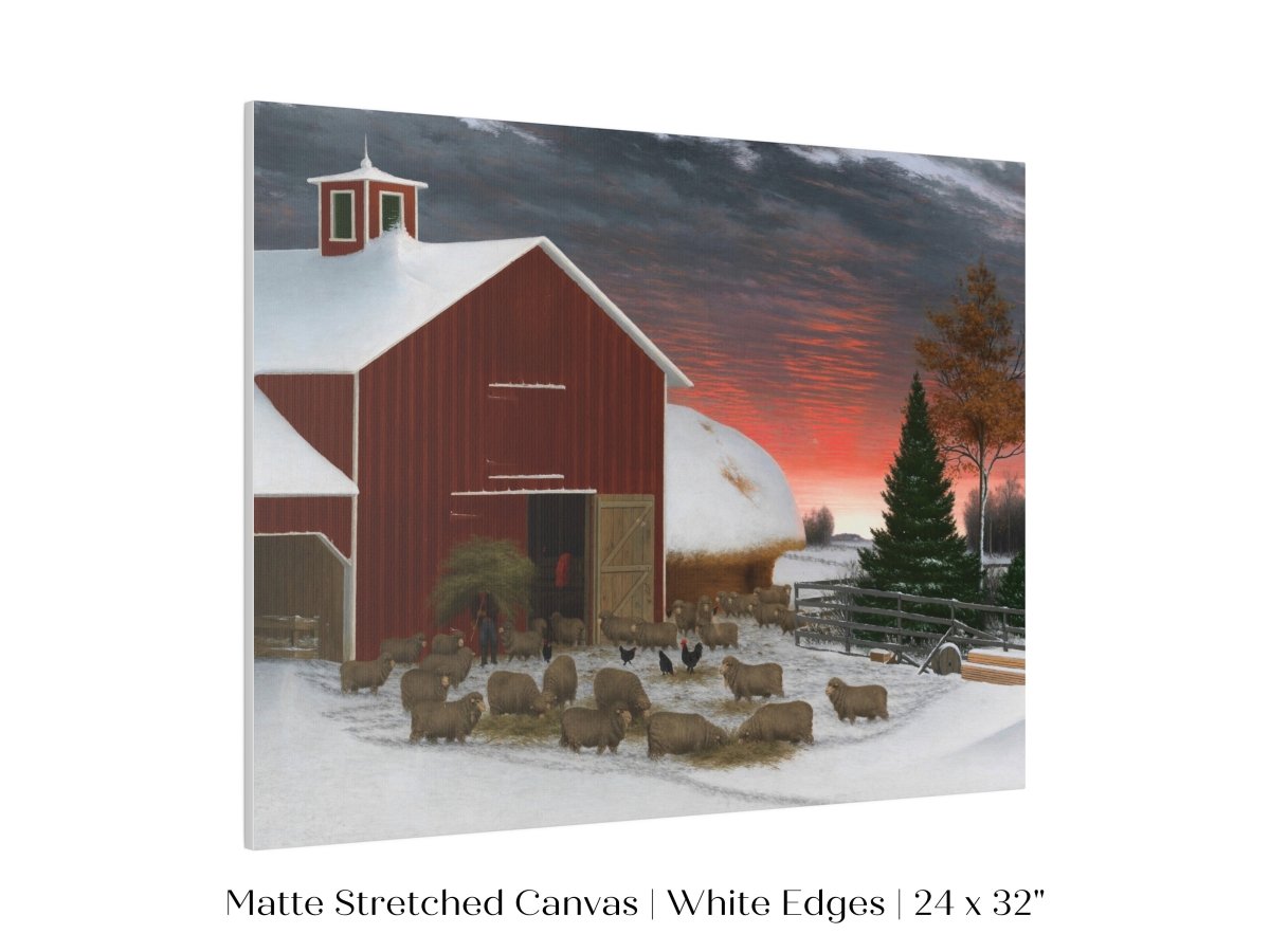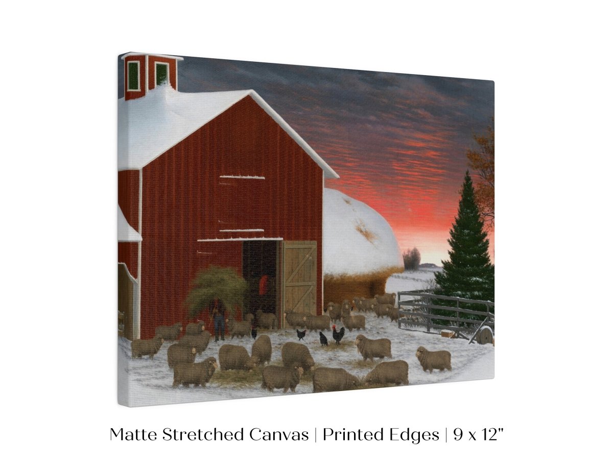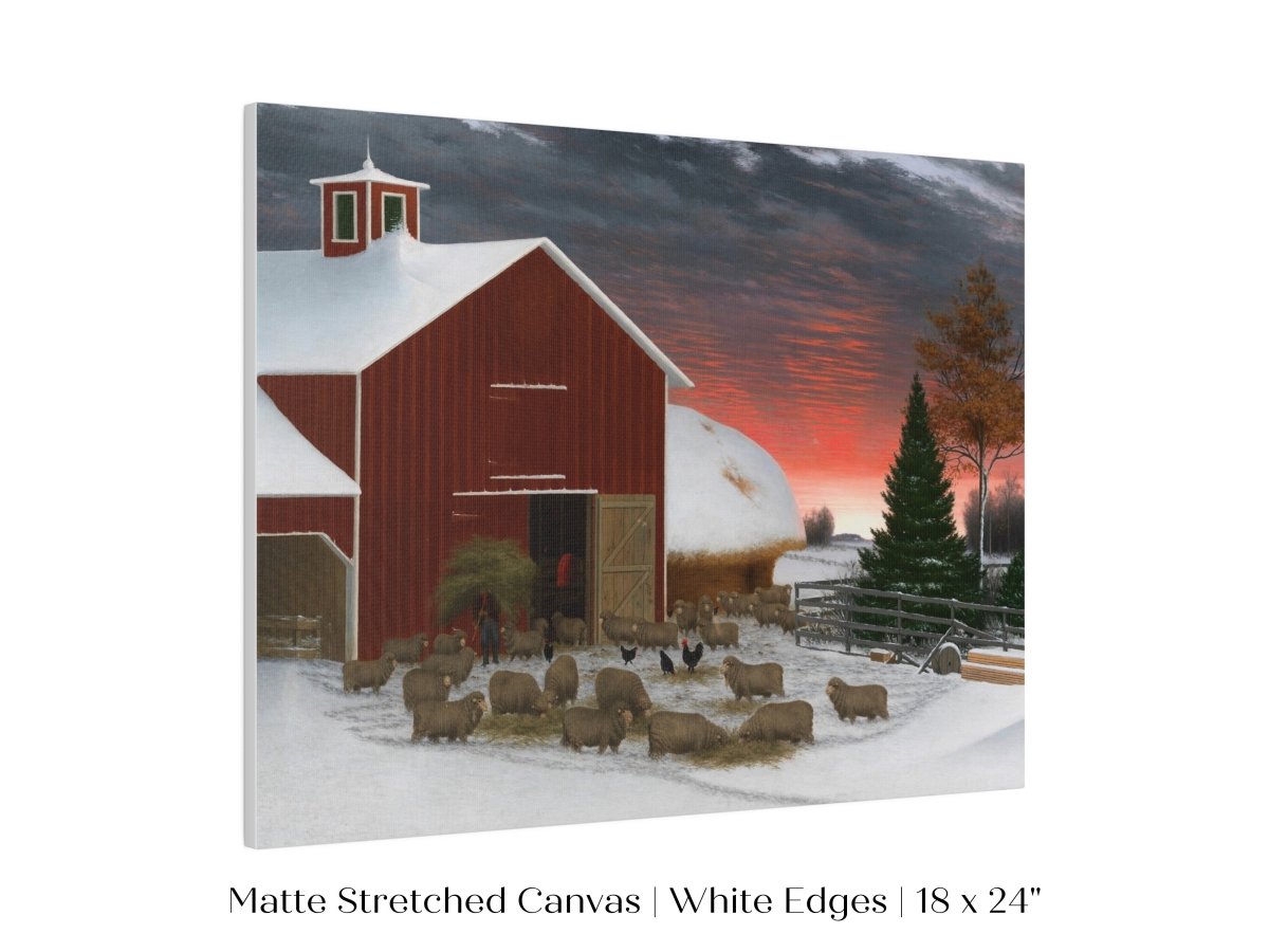 Vintage Barnyard in Winter snowy farmhouse/country landscape oil painting in burgundy, grey and white colour palette.