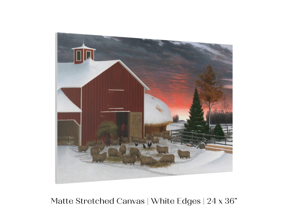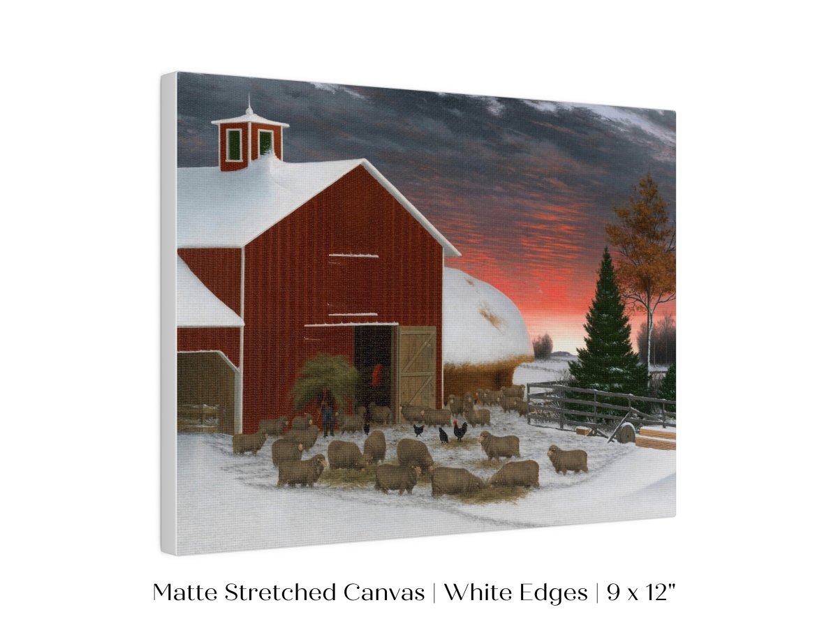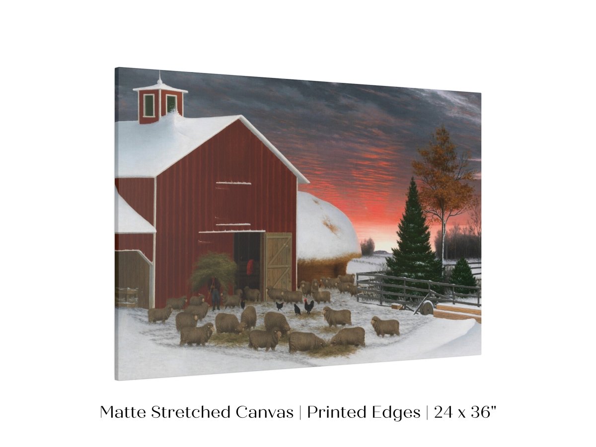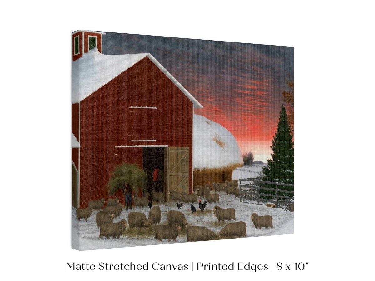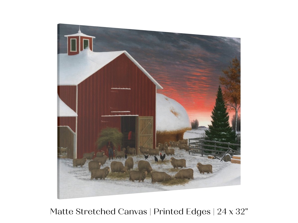 Vintage Barnyard in Winter snowy farmhouse/country landscape oil painting in burgundy, grey and white colour palette.