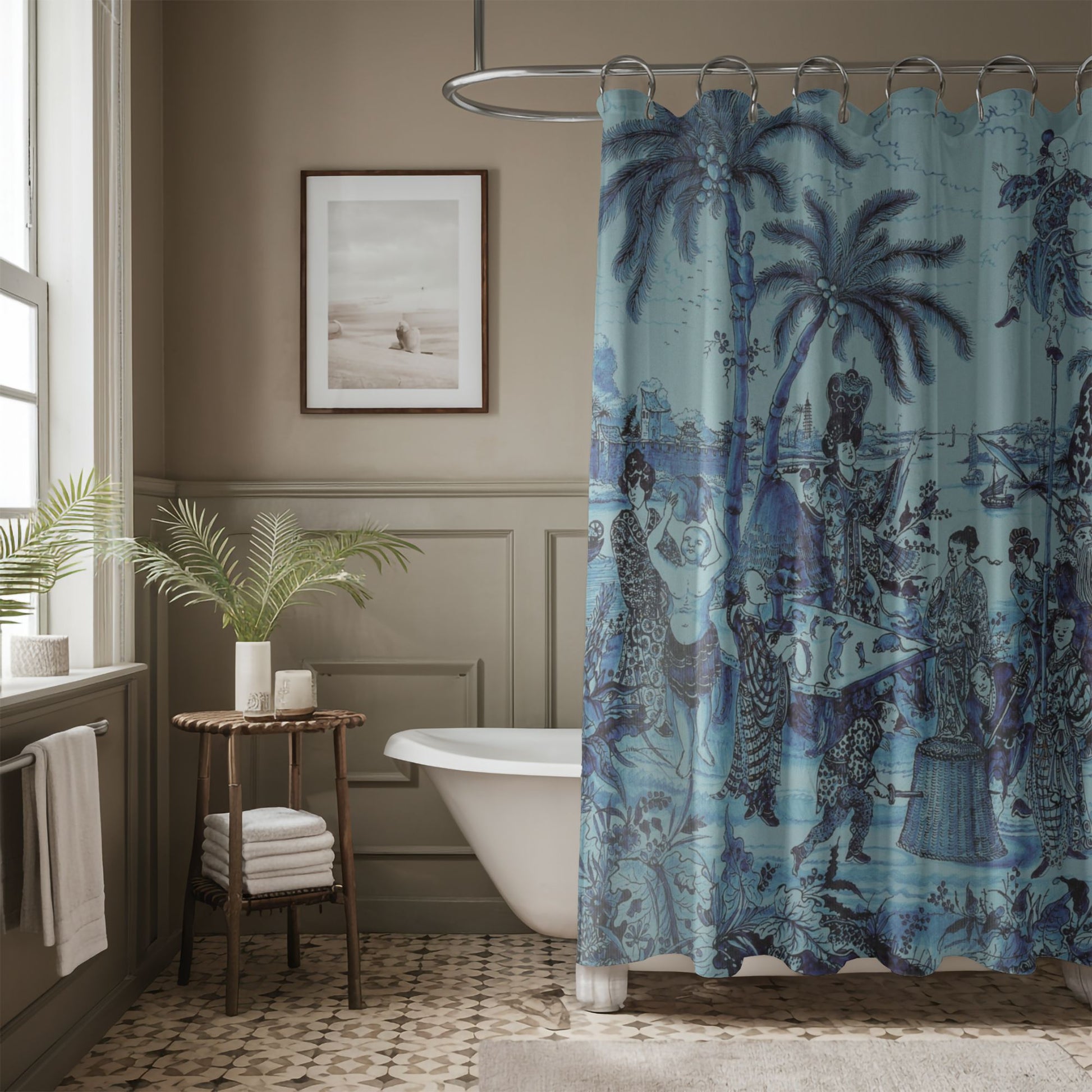 Bring timeless style and a refreshing pop of colour to your bathroom with our turquoise chinoiserie shower curtain. This elegant design features classic vintage scenery - graceful trees, florals, people and traditional chinoiserie detailing - reimagined in a vibrant turquoise palette that instantly brightens any space. Perfect for lovers of classic décor, grandmillennial style, and bold-yet-refined bathroom accents.