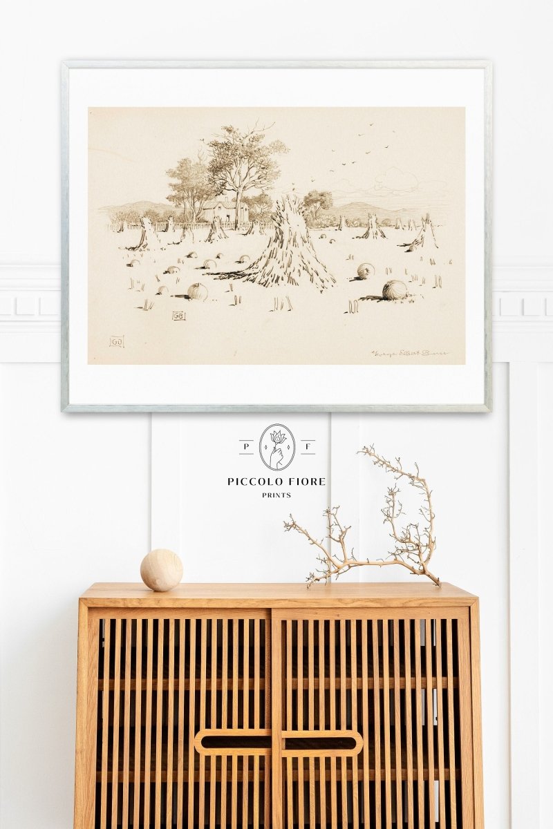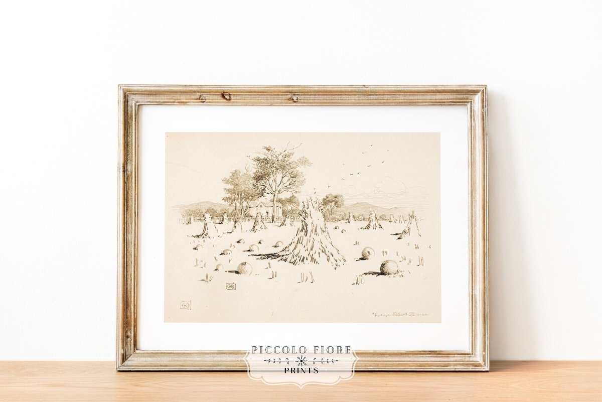 Vintage field harvest scene country/farmhouse sketch/drawing (ca 1890s).