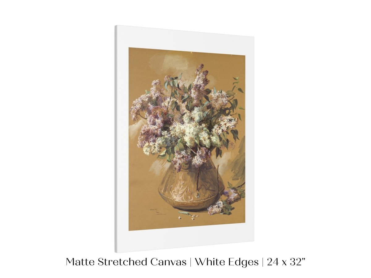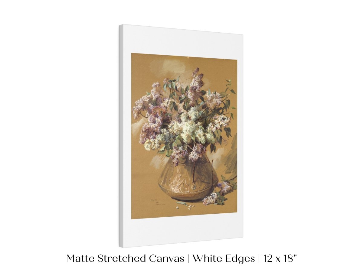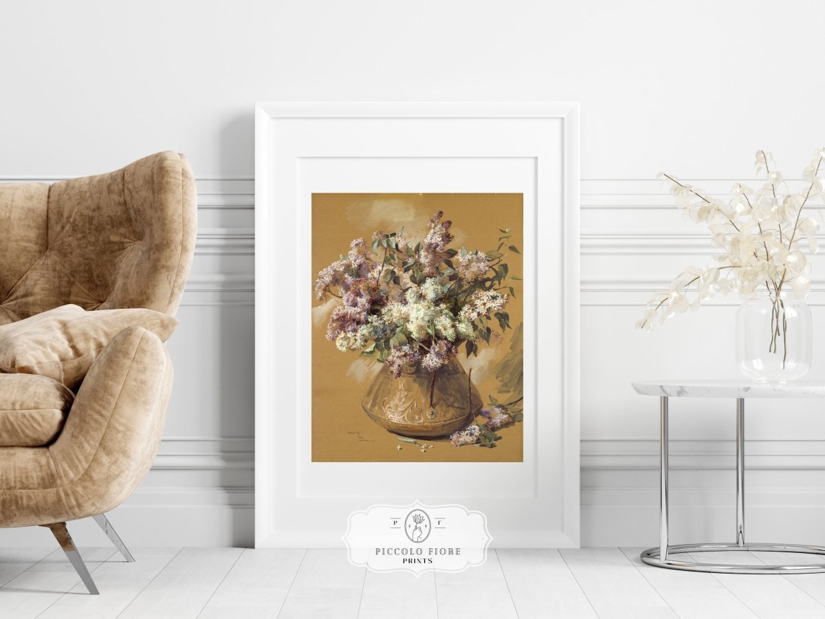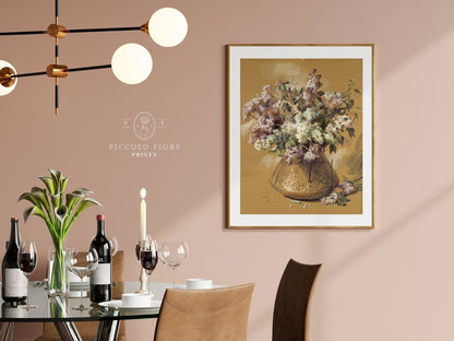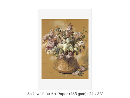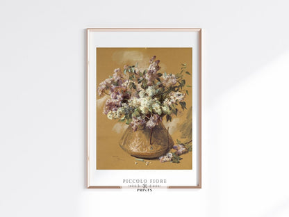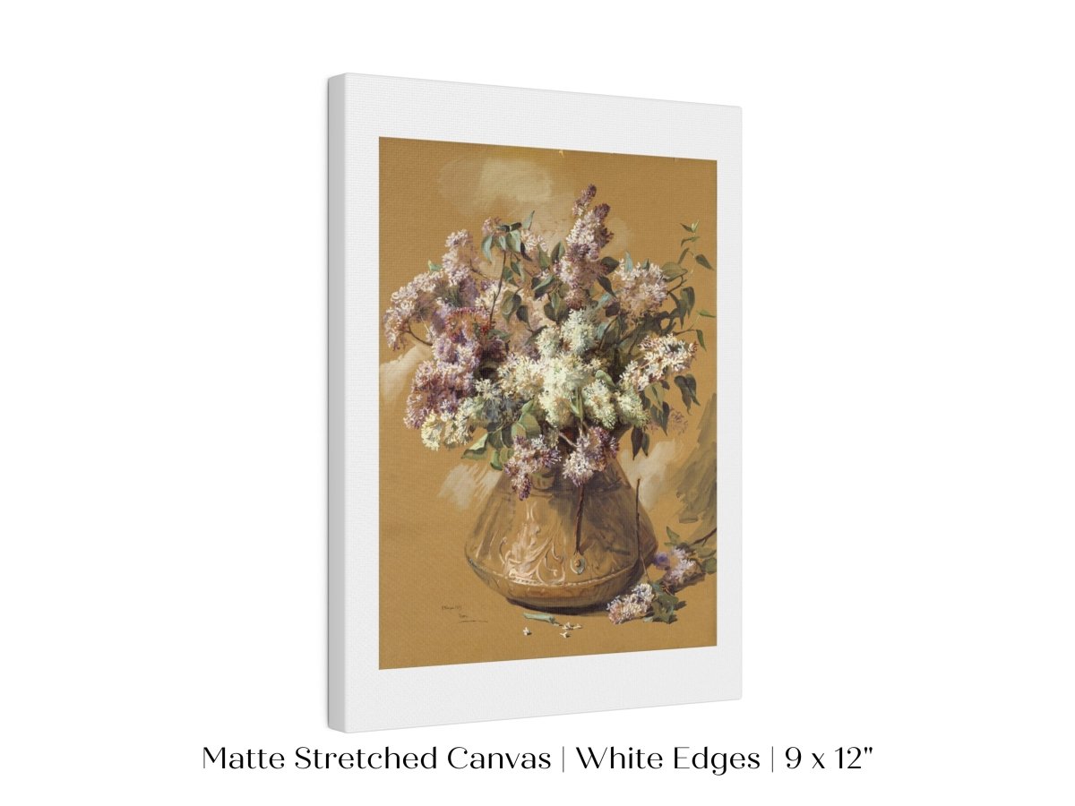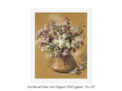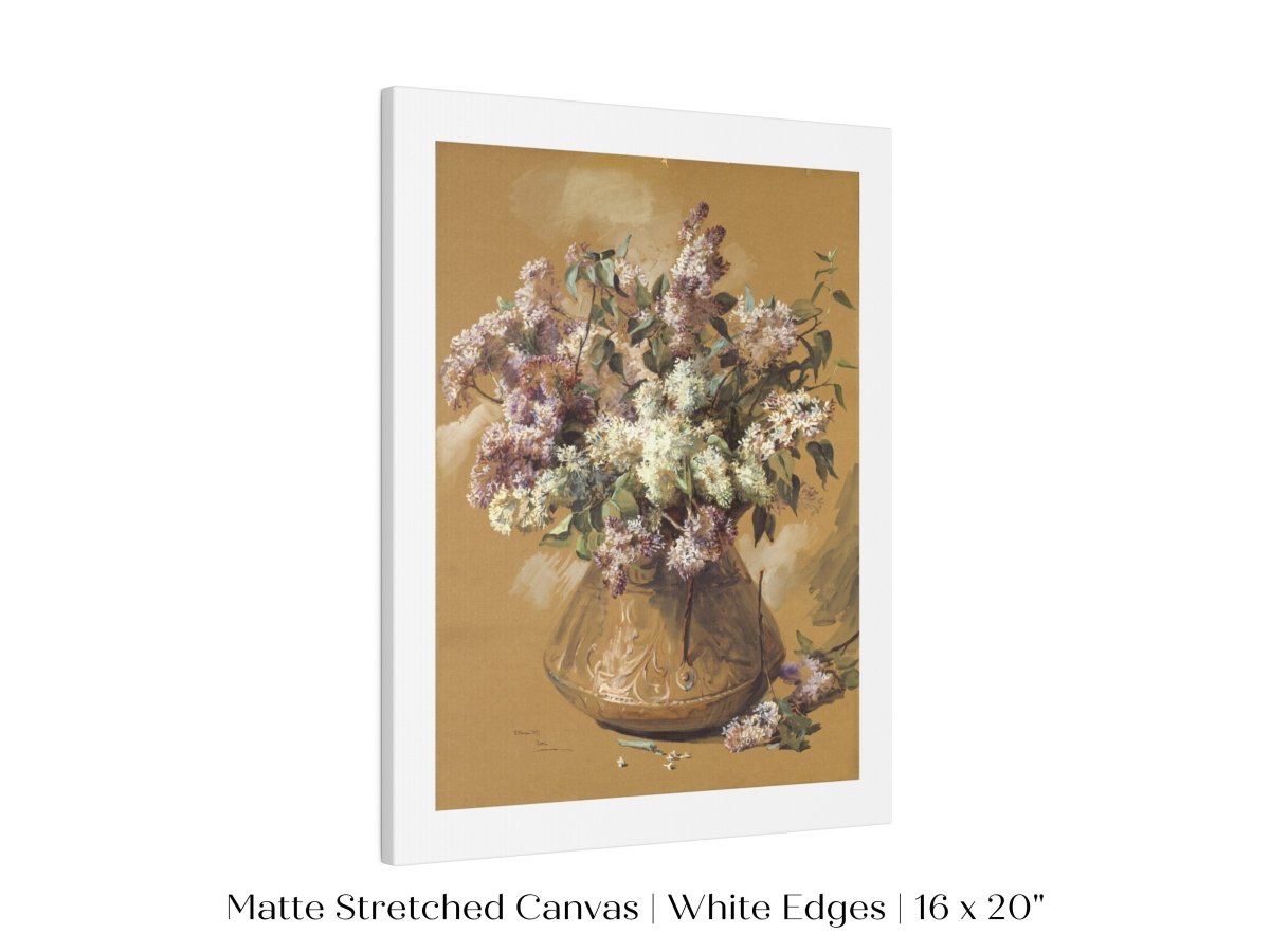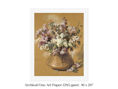 Lilacs still life opaque watercolour painting by Elizabeth Nourse (1891) featuring a vase of lilac flowers in a golden and lilac colour palette.