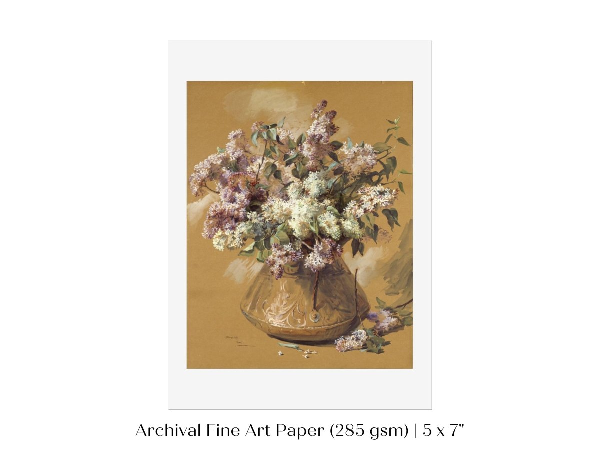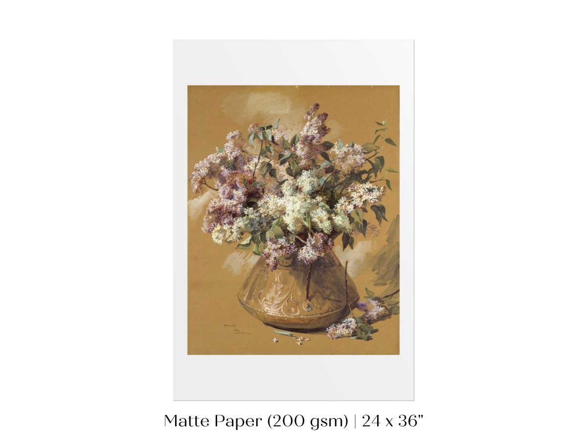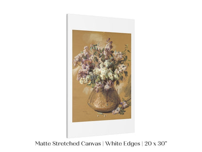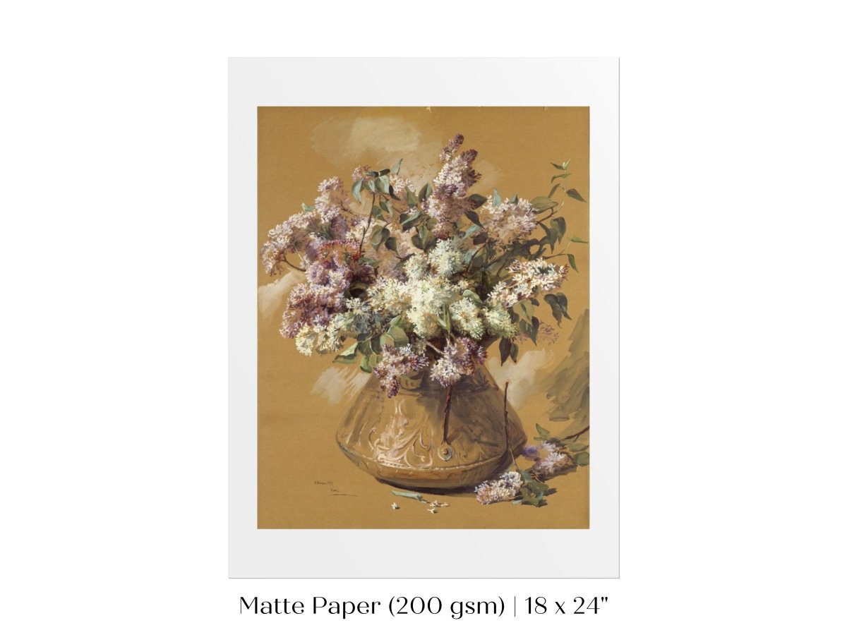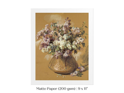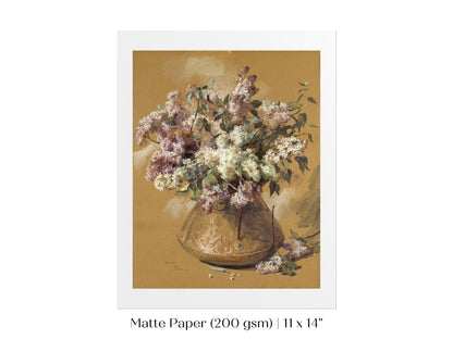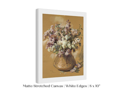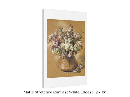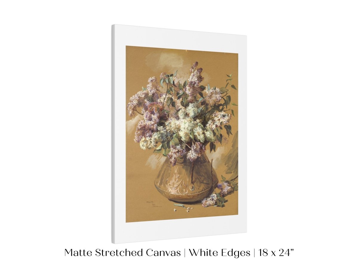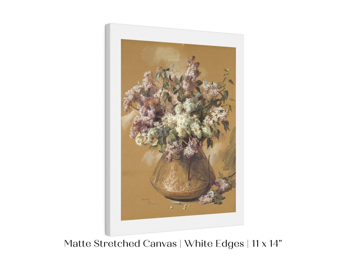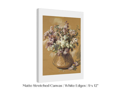 Lilacs still life opaque watercolour painting by Elizabeth Nourse (1891) featuring a vase of lilac flowers in a golden and lilac colour palette.