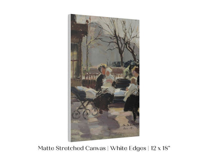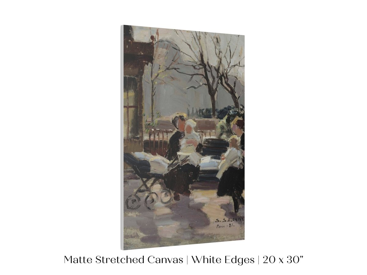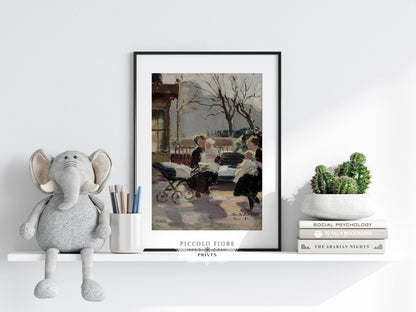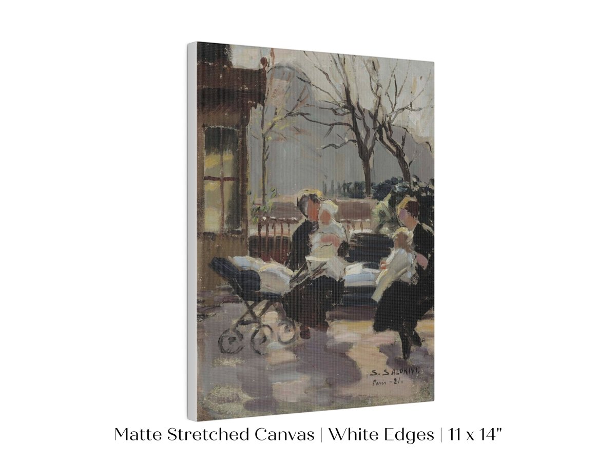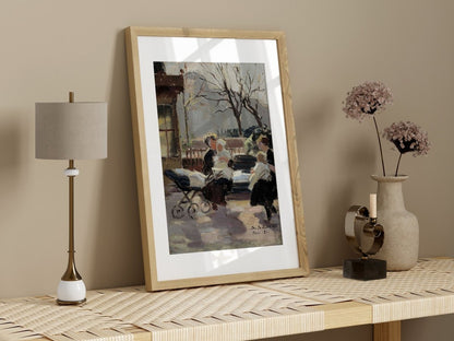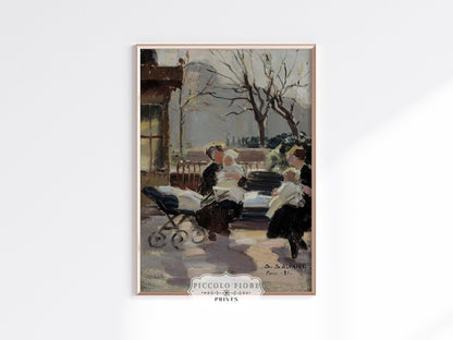 Vintage oil painting from the early 1920s of two mothers with their babies and pram sitting on a park bench in Paris in neutral grey, beige and black colour palette.