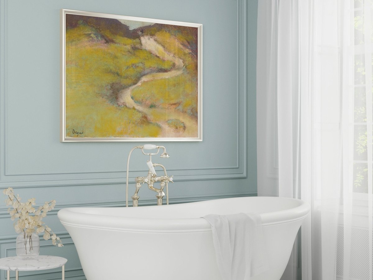 Vintage minimalist oil painting of a pathway in a field in a vibrant lime green colour palette.