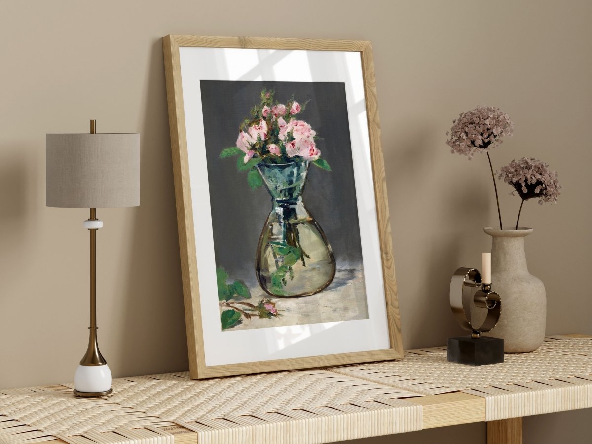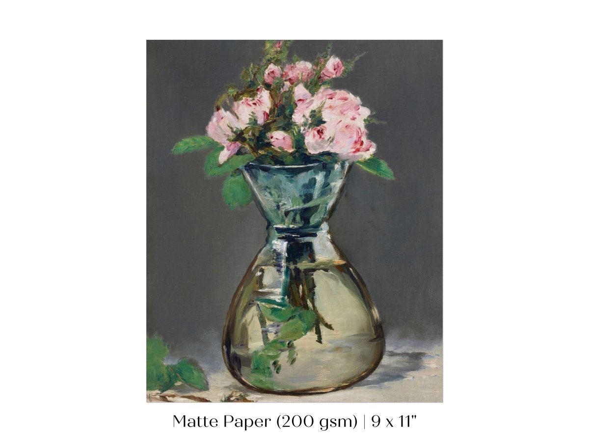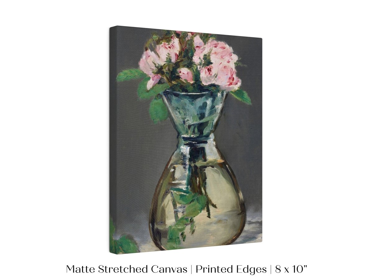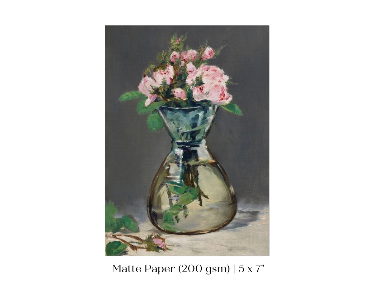 Vintage Pink Moss Roses in a Vase still life oil painting.