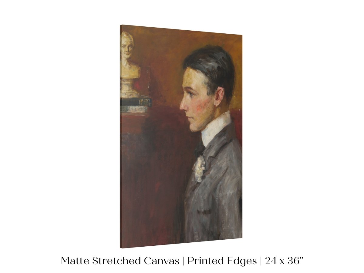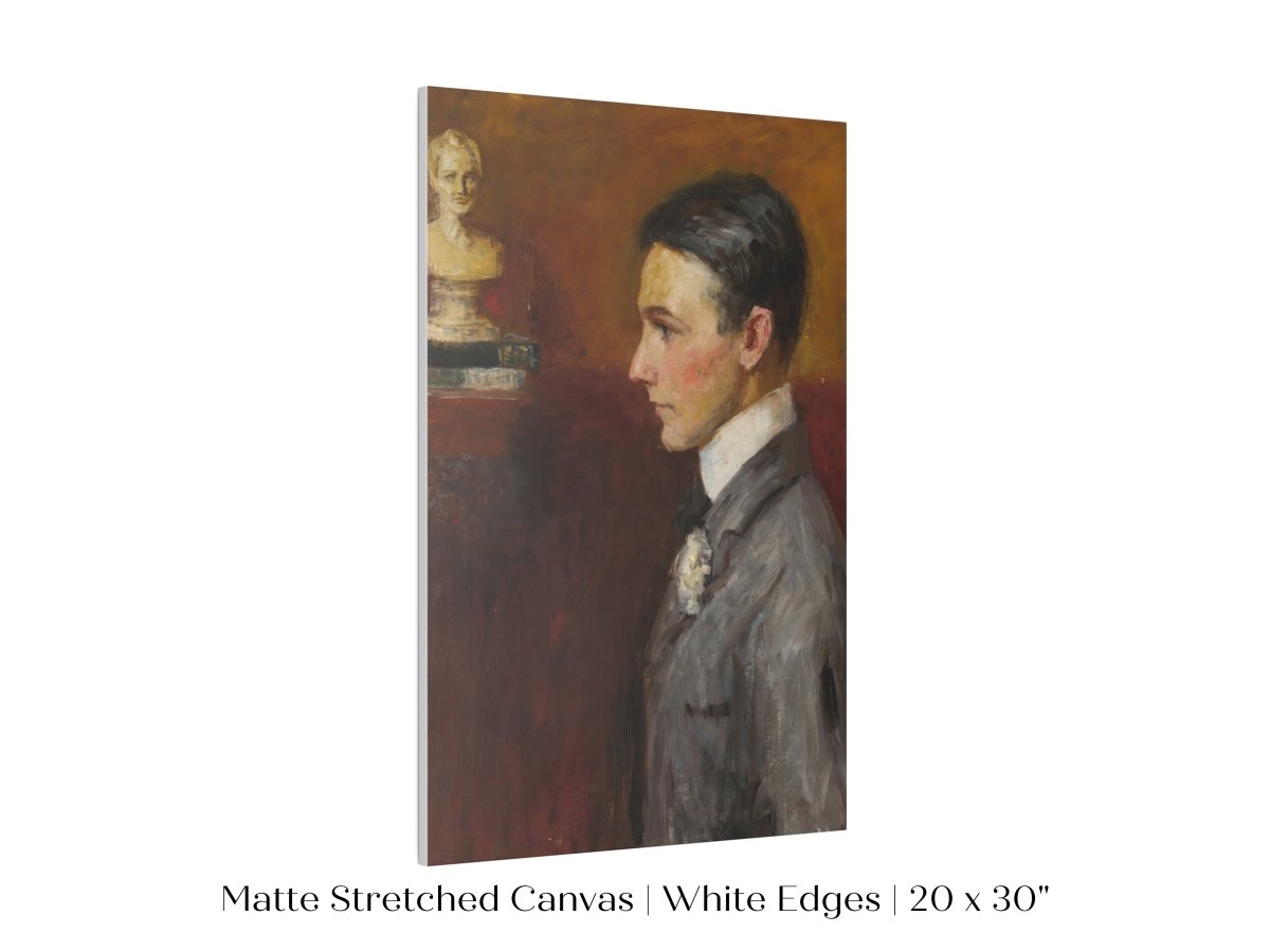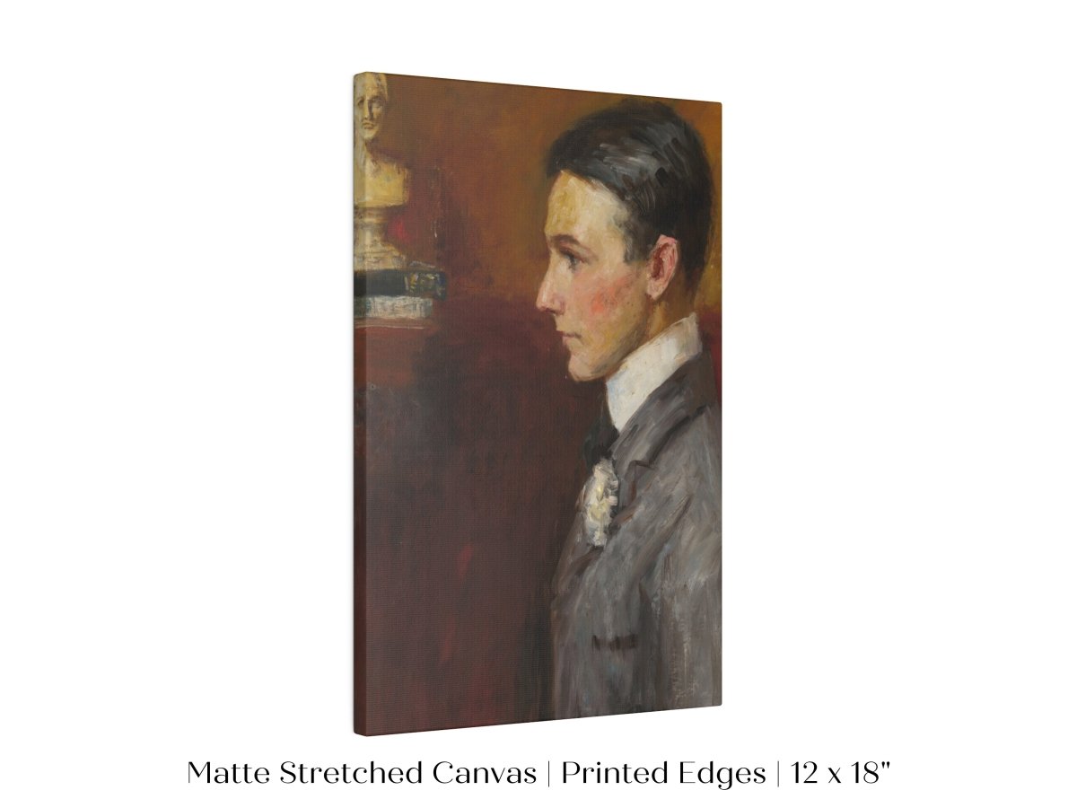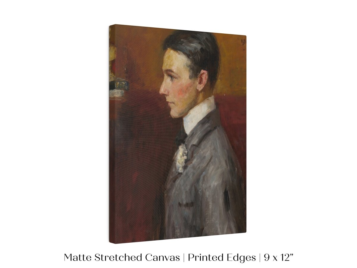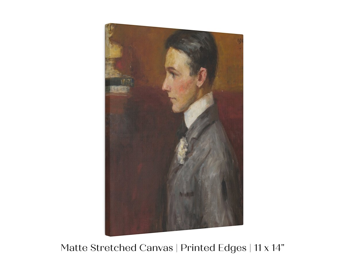 Vintage side profile portrait of a young man in a grey suit with a red/tan wall behind him.