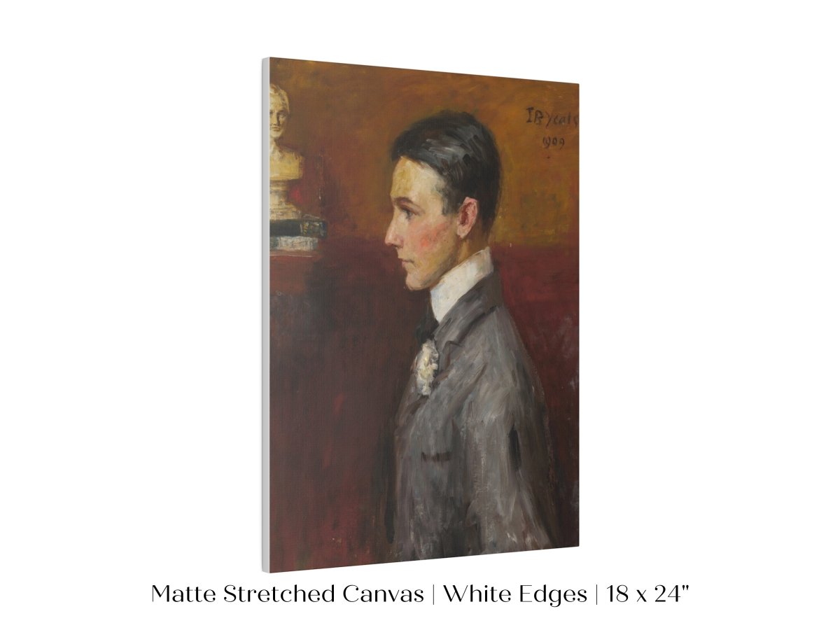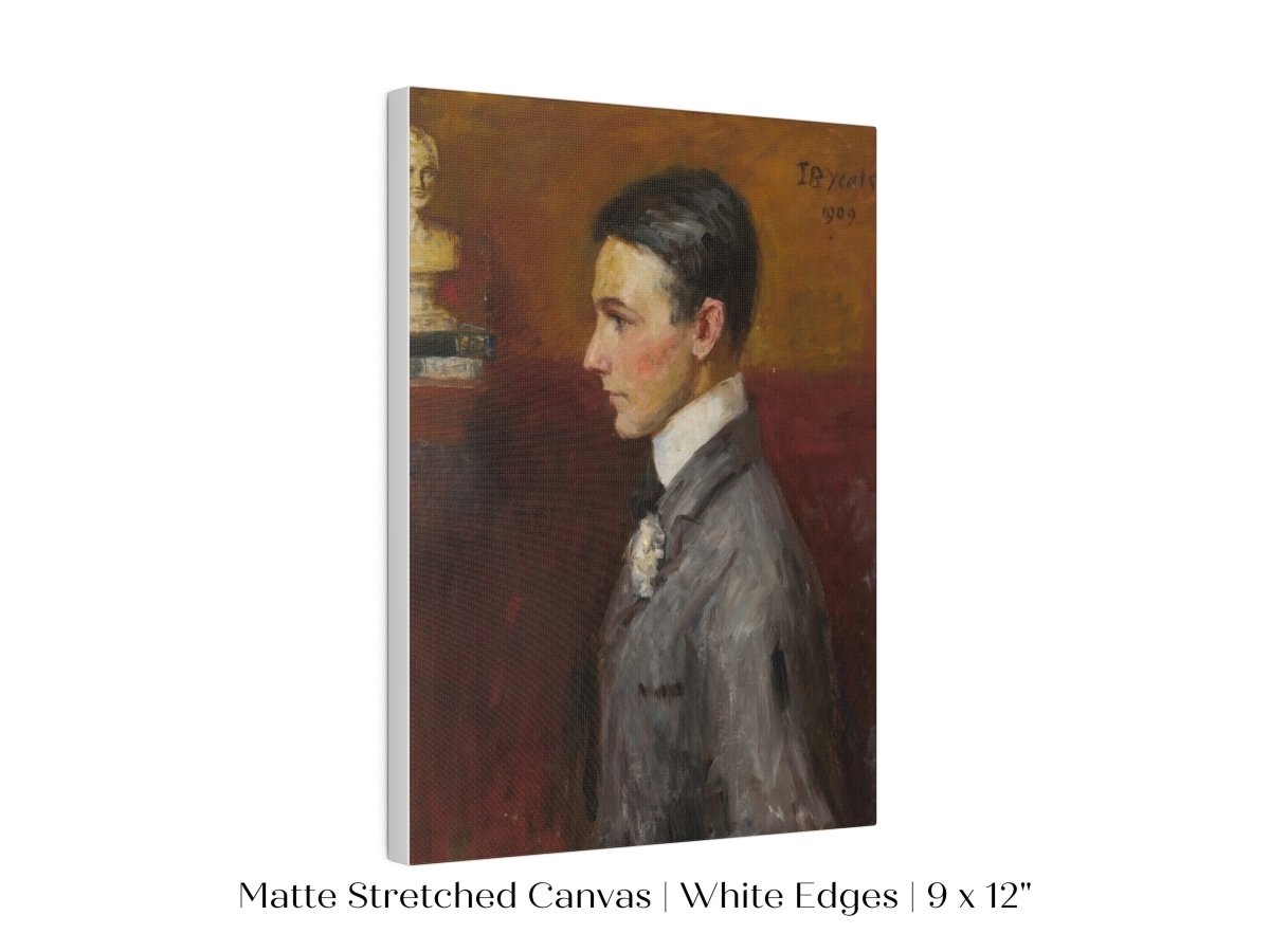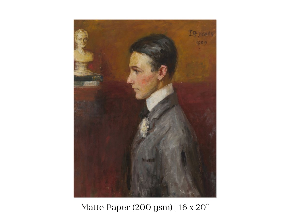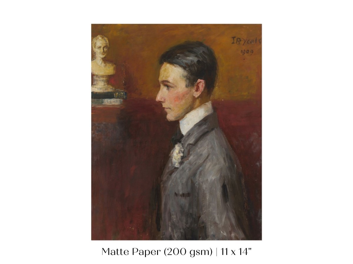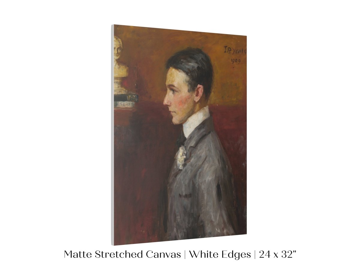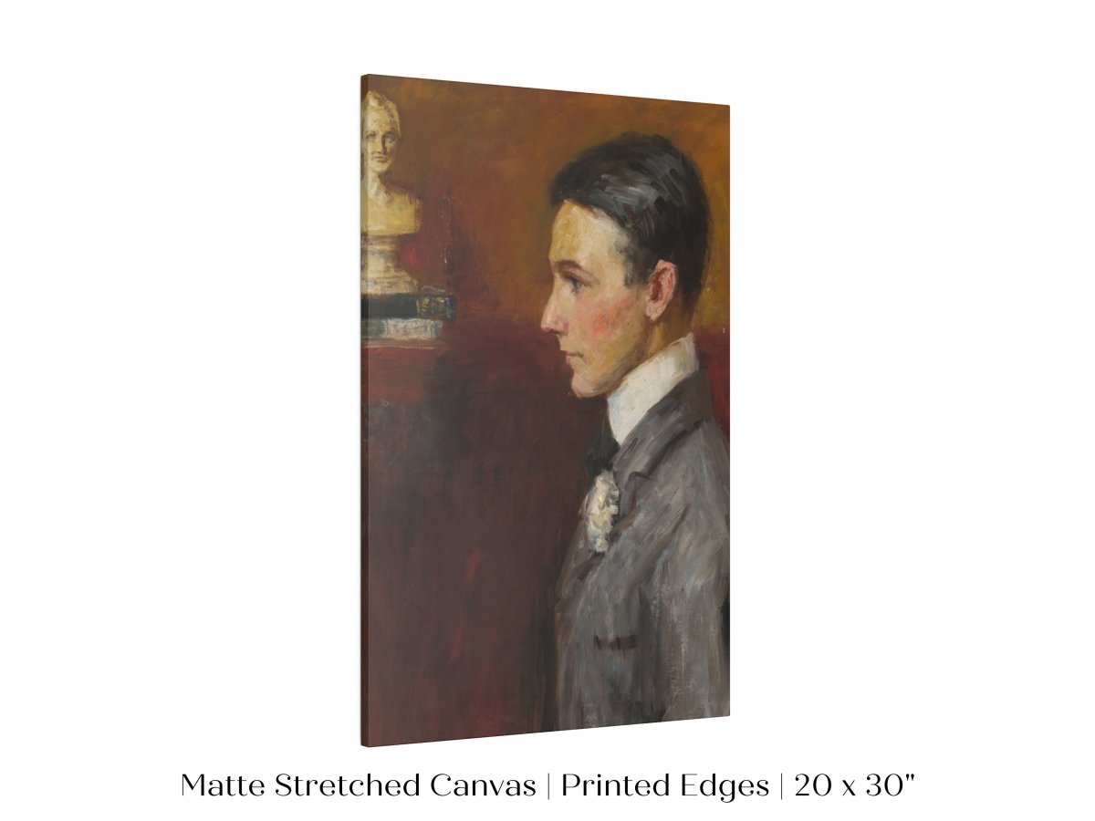 Vintage side profile portrait of a young man in a grey suit with a red/tan wall behind him.