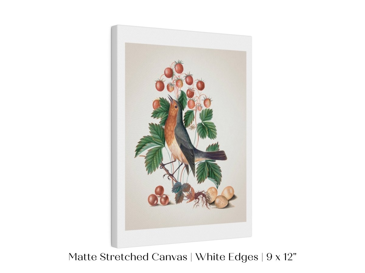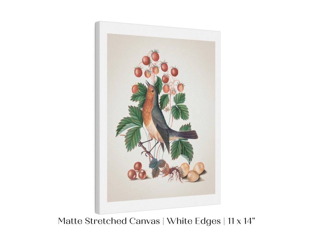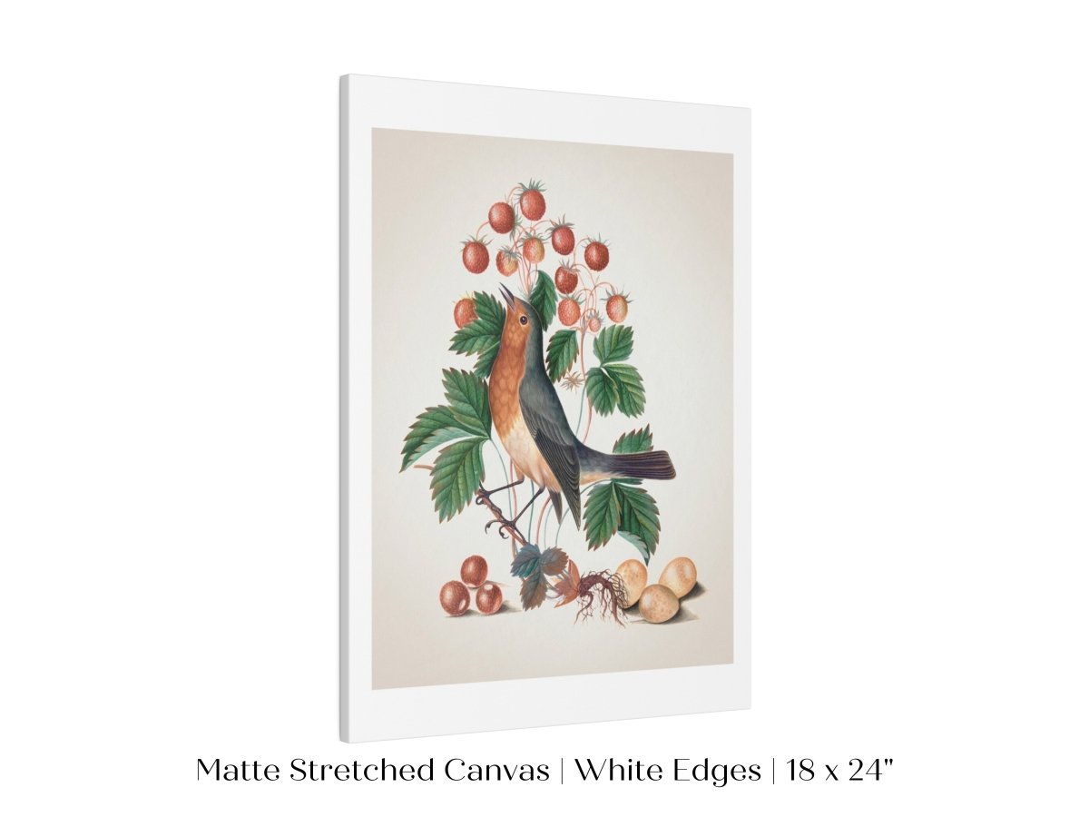Vintage bird natural history illustration from the 1700s featuring a robin eating strawberries.